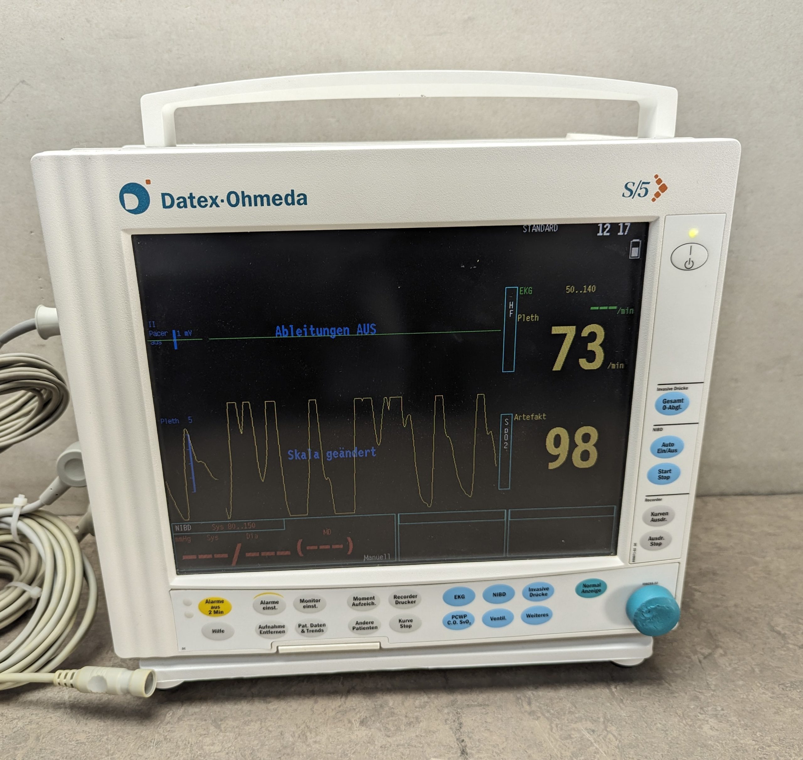 Fazit: Der Datex Ohmeda F-CM1 S5 Überwachungsmonitor mit Zubehör stellt eine professionelle Lösung für die umfassende Überwachung vitaler Patientendaten dar. Seine vielfältigen Funktionen, die ergonomische Bedienbarkeit und die hohe Genauigkeit machen ihn zur ersten Wahl für medizinisches Fachpersonal, das Wert auf Sicherheit und Effizienz legt.