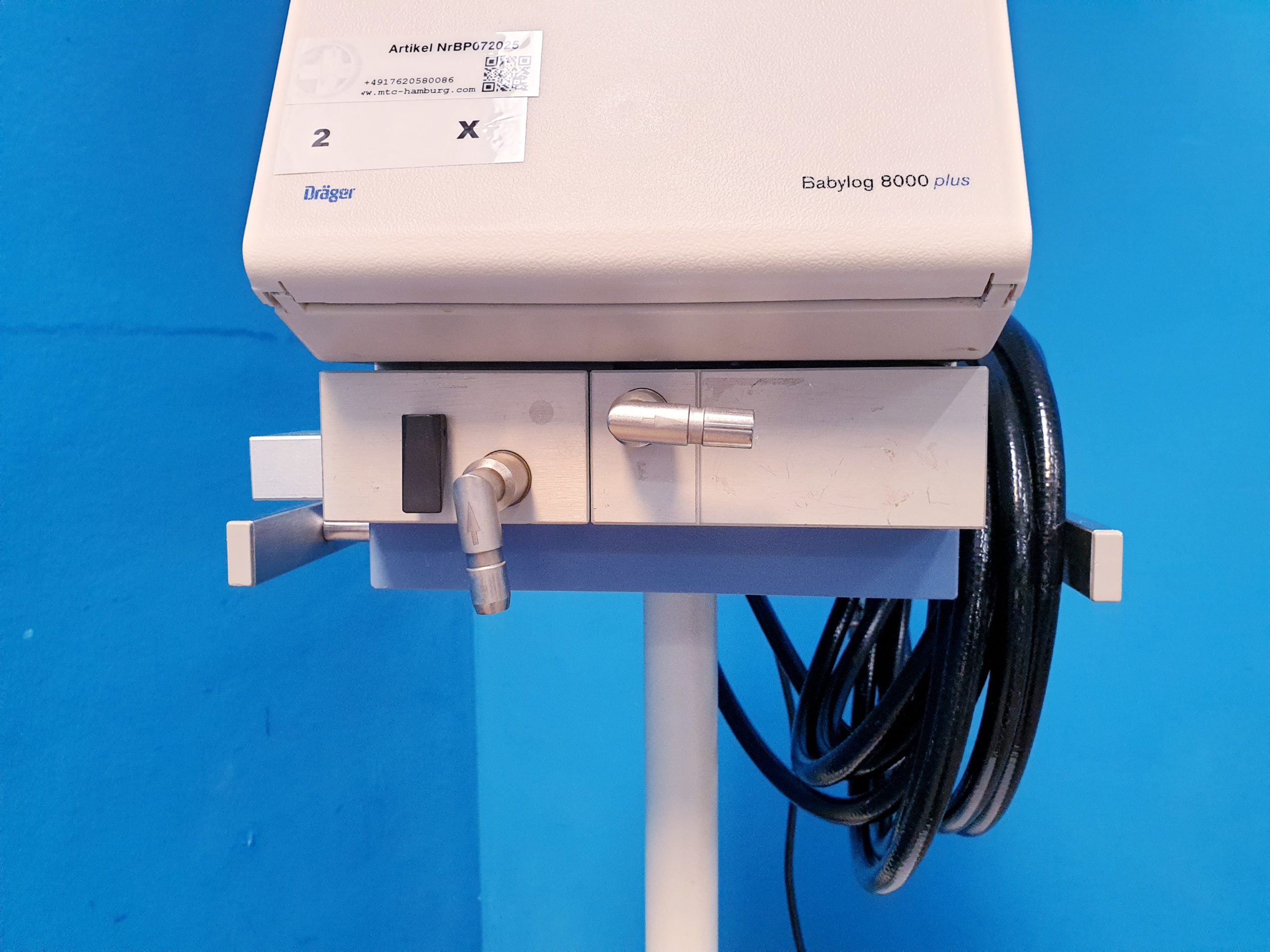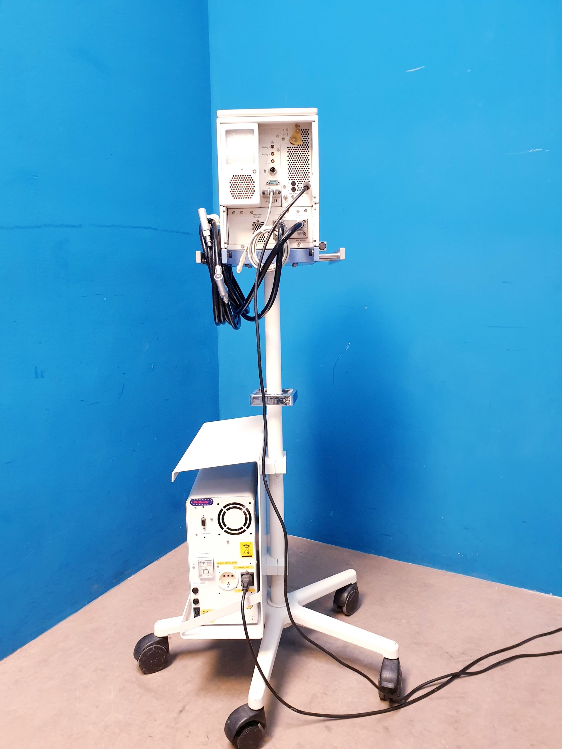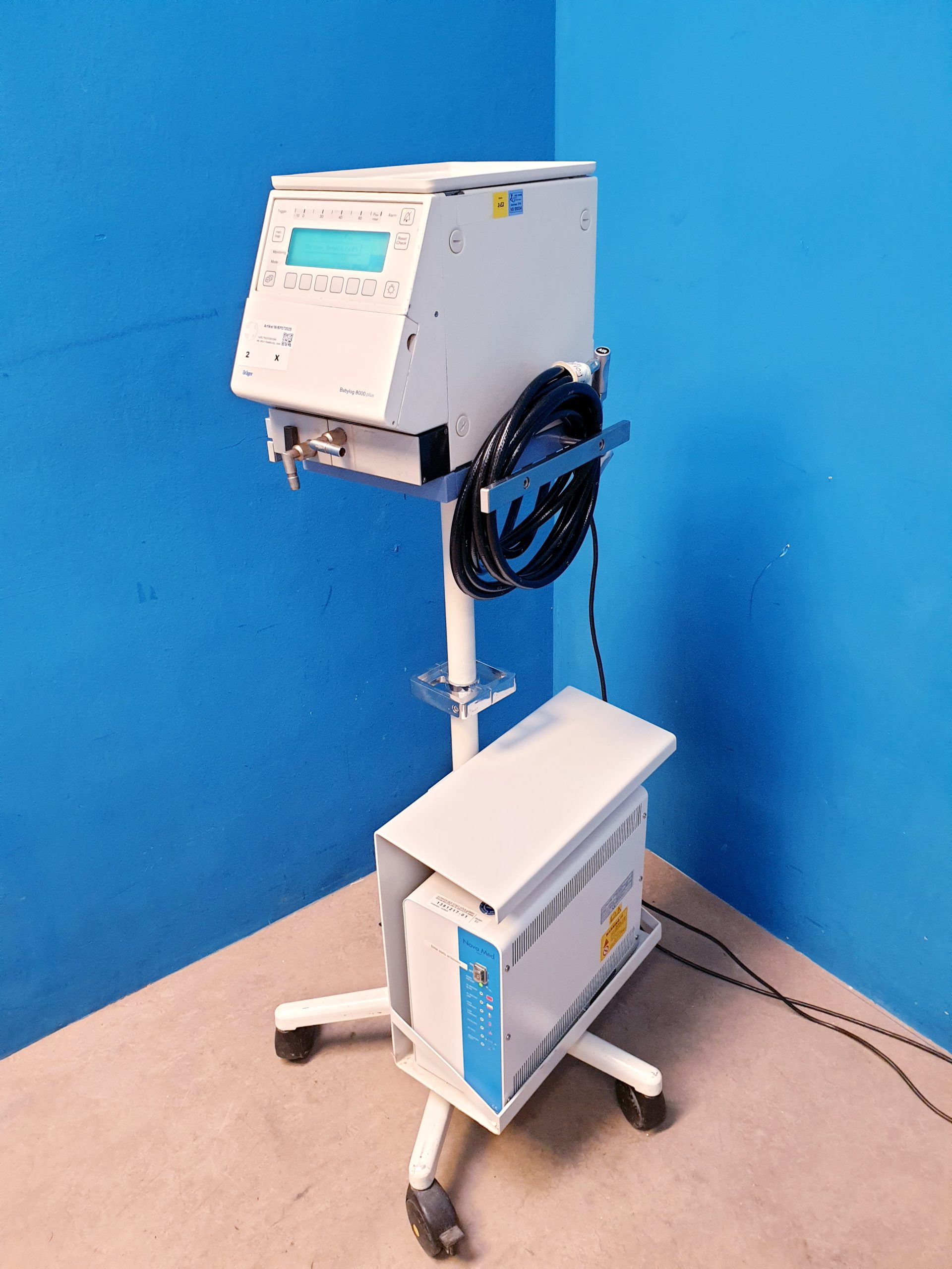 Dräger 8000 plus Beatmungsgerät kombiniert mit dem Dräger Babylog und einem fahrbaren Stativ bietet präzise und zuverlässige Beatmungslösungen für Neugeborene und pädiatrische Patienten. Das Gerät gewährleistet eine benutzerfreundliche Handhabung und hohe Flexibilität im klinischen Alltag.