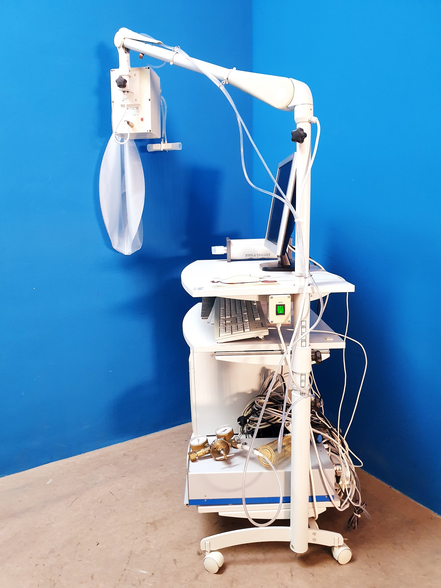 Der Ganshorn Helirapid III Bodyplethysmograph in Kombination mit dem BodyScope stellt ein hochmodernes Diagnostiksystem zur umfassenden Lungenfunktionsanalyse dar. Dieses medizinische Gerät ermöglicht die präzise Messung von Atemvolumina und -widerständen in einer geschlossenen Kammer, wodurch eine exakte Beurteilung der pulmonalen Funktion möglich ist.