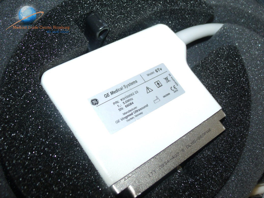 The GE 6TV ultrasound transducer probe which is compatible with GE Logiq 5, 7, 9 and Vivid 3, 7 ultrasound systems.