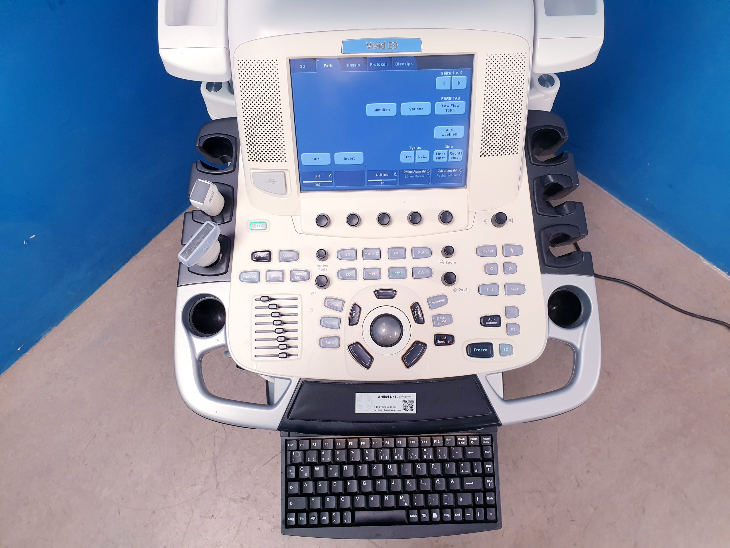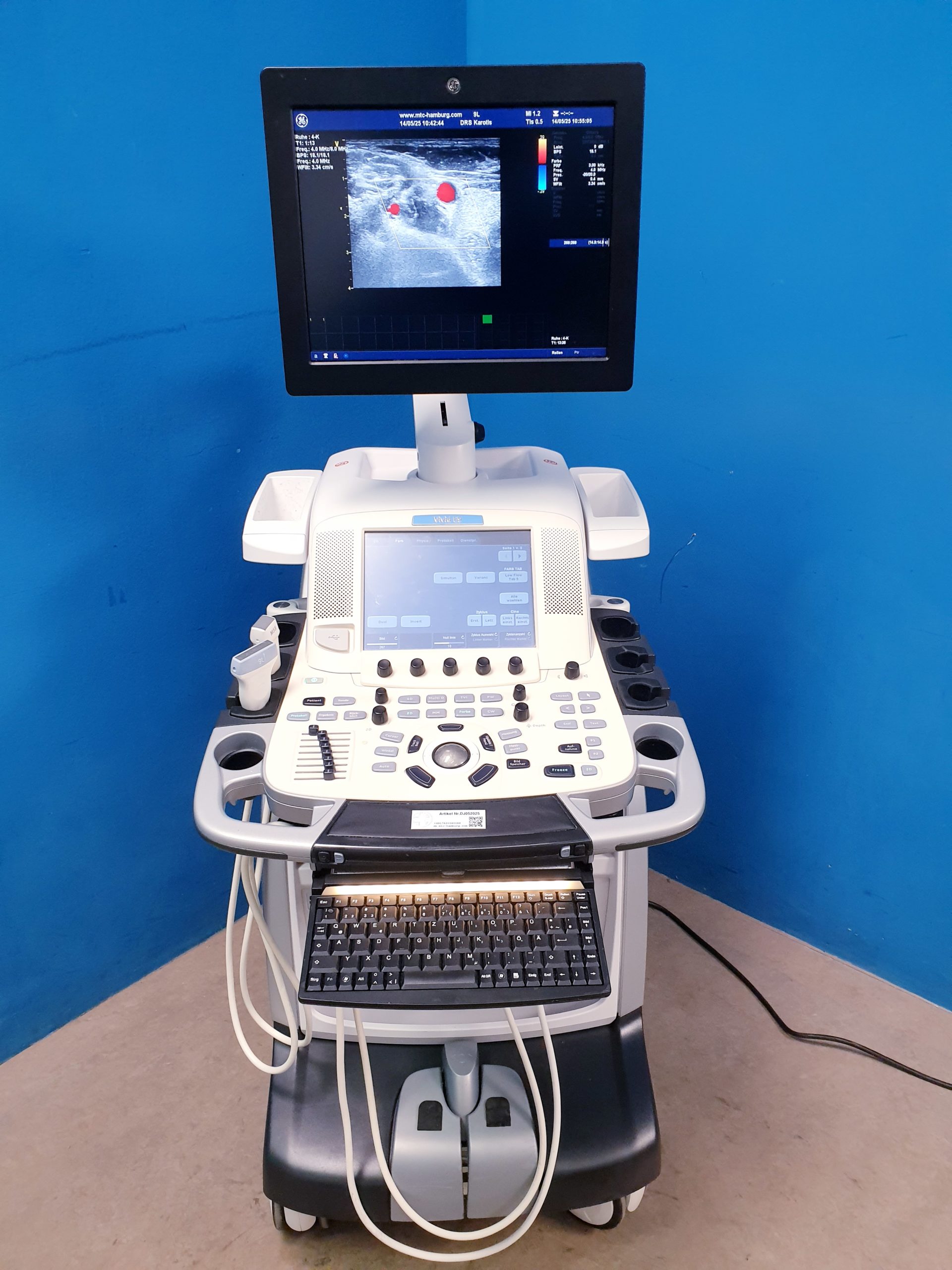 - 9L Linear-Schallkopf: Ergänzend zum kardialen Schallkopf bietet der 9L Linear-Transducer exzellente Bildgebung von peripheren Gefäßen und oberflächlichen Strukturen, ideal für vaskuläre Untersuchungen und Zusatzdiagnostik.
