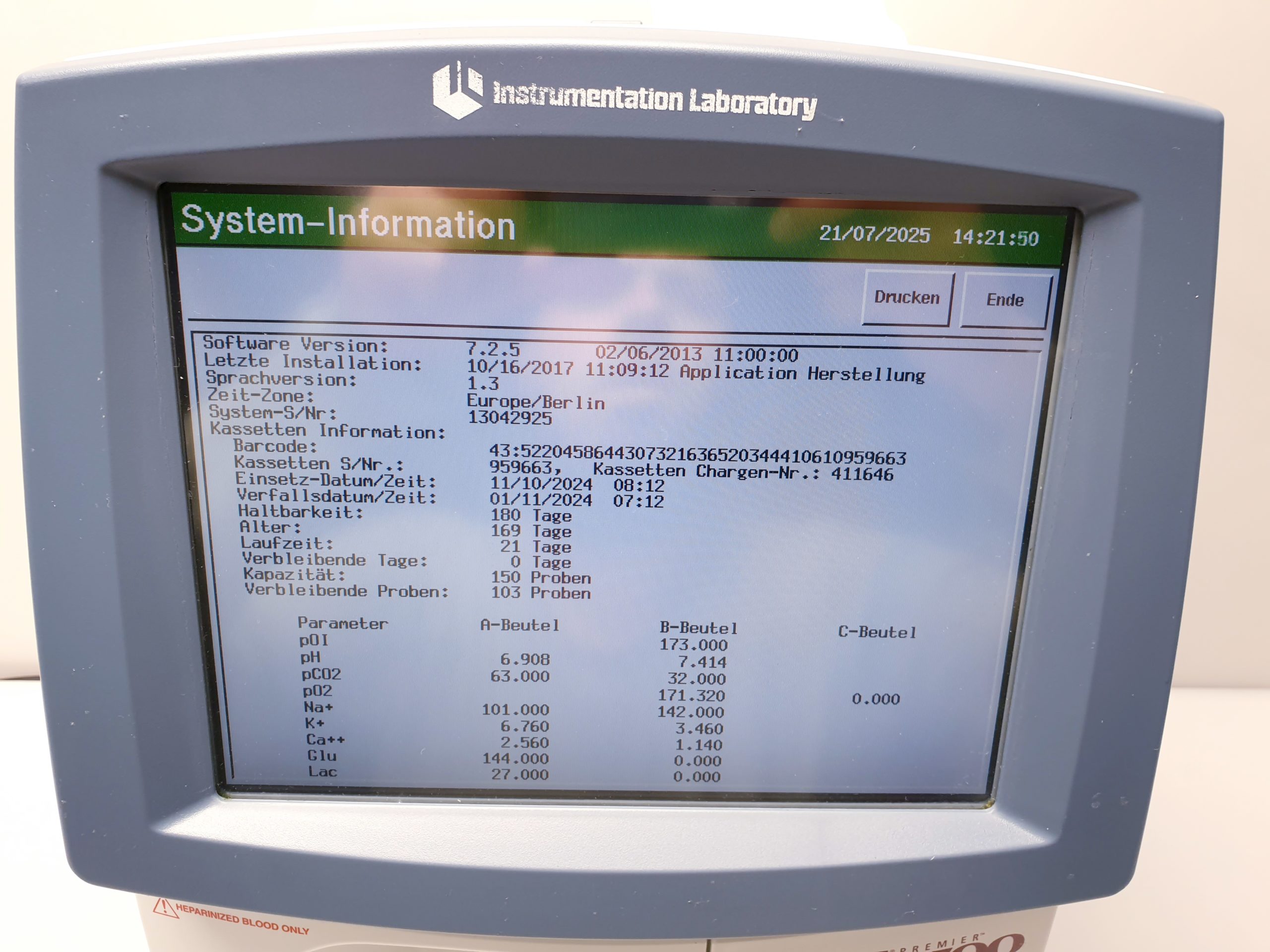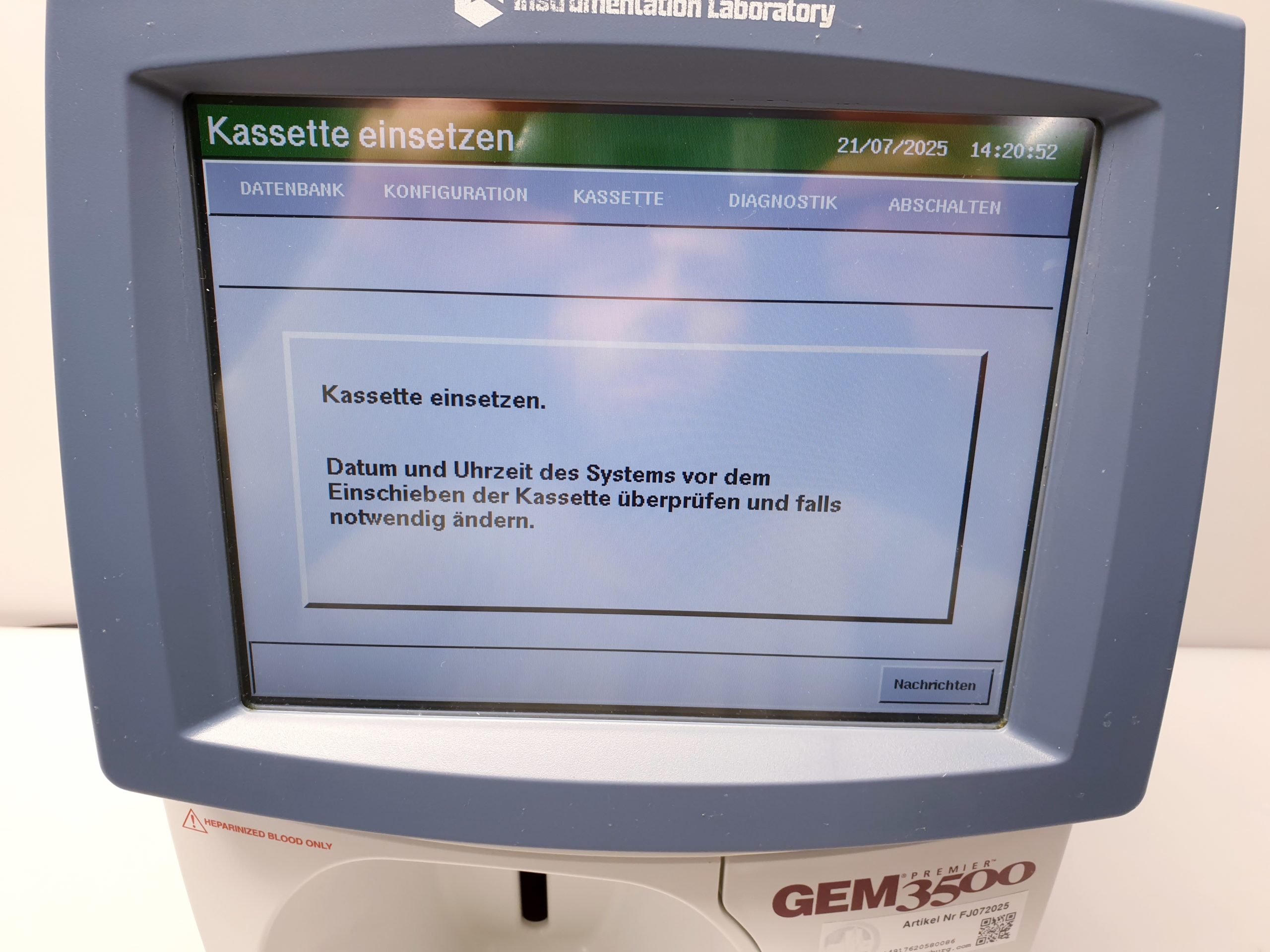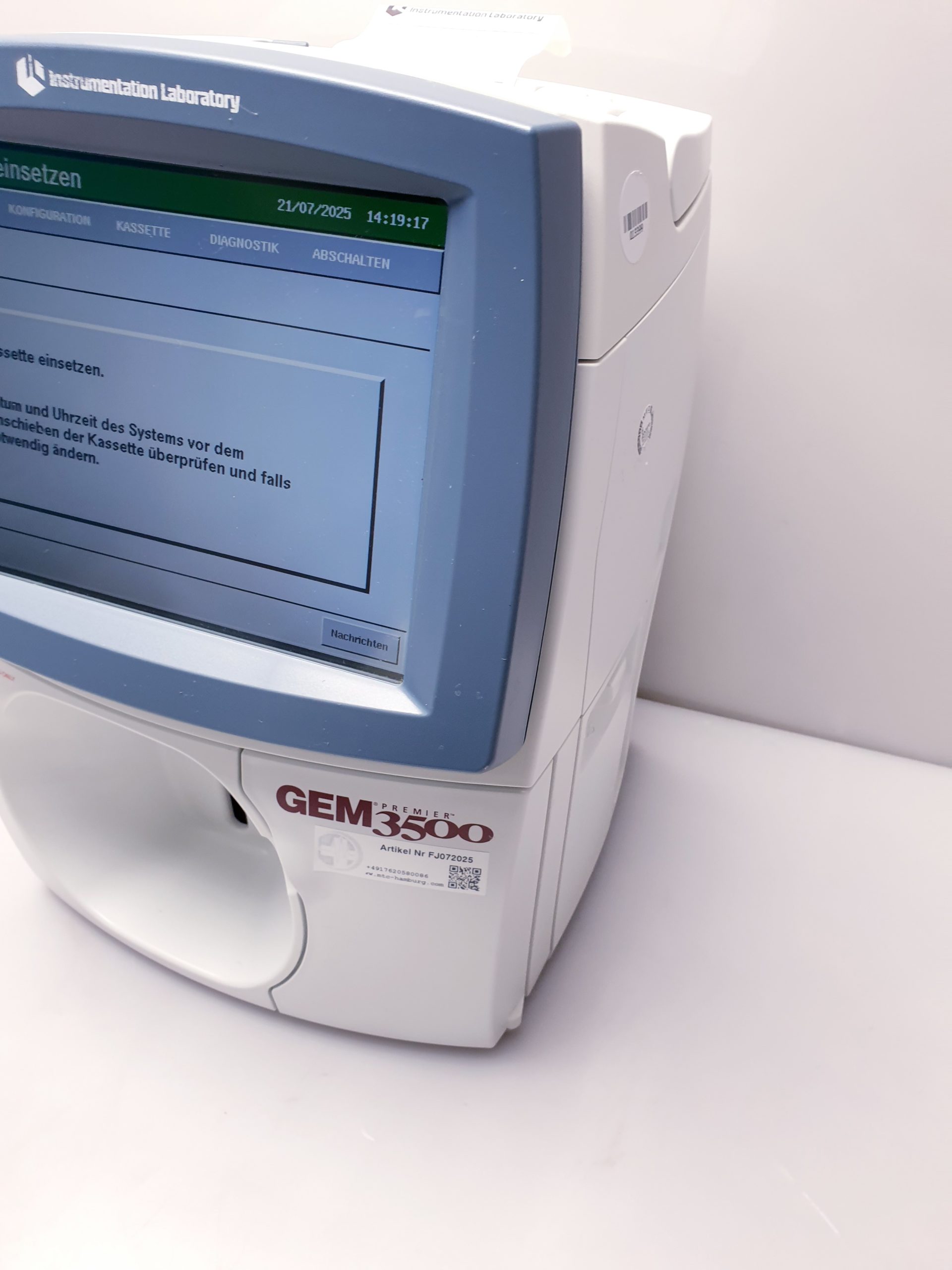 INSTRUMENTATION LABORATORY GEM Premier 3500 ist ein hochmodernes Blutgasanalysegerät, das präzise und schnelle Ergebnisse für klinische Diagnostik liefert. Es kombiniert zuverlässige Messtechnologie mit benutzerfreundlicher Handhabung und unterstützt eine effiziente Patientenversorgung im Labor und am Point-of-Care.