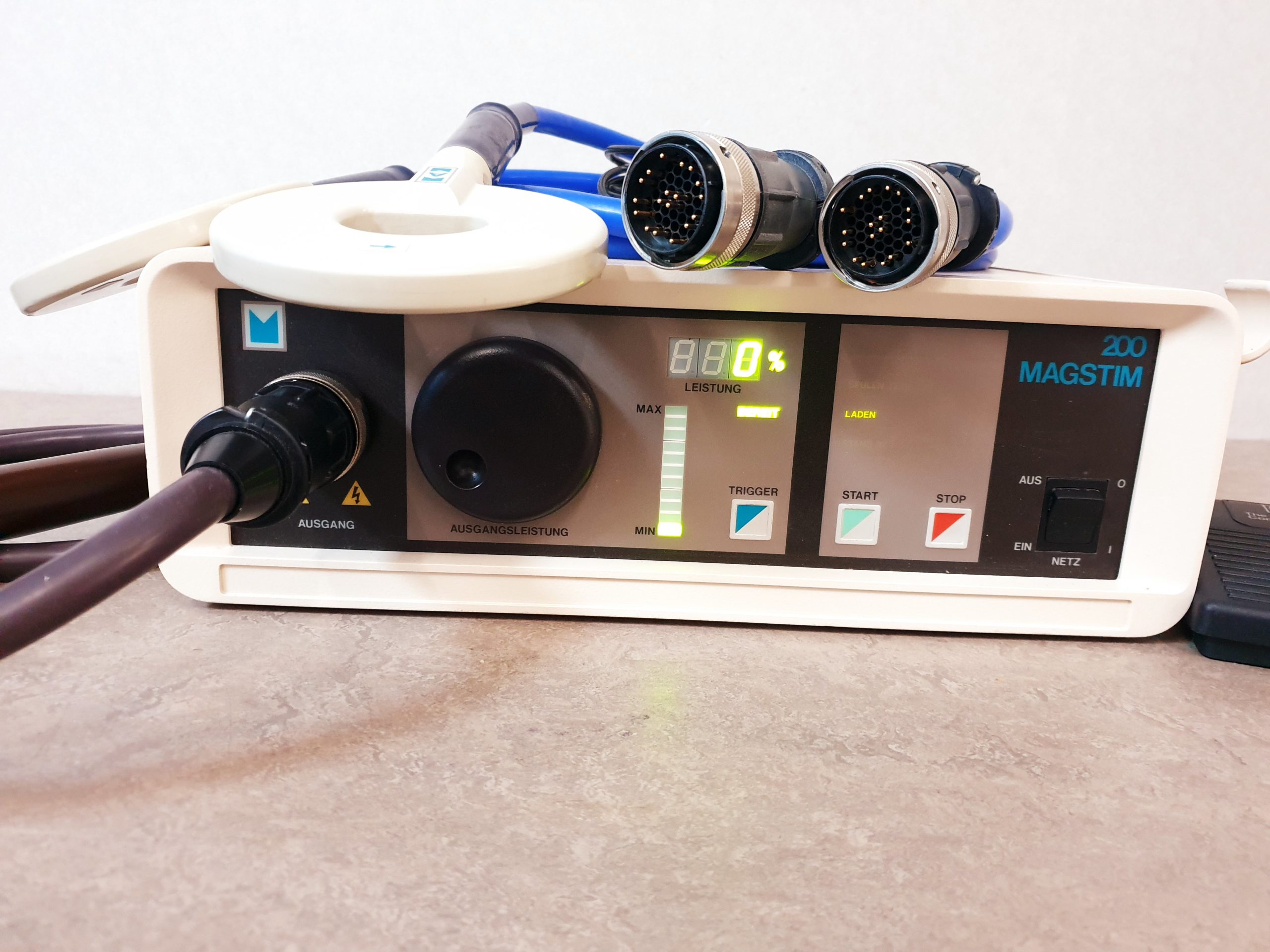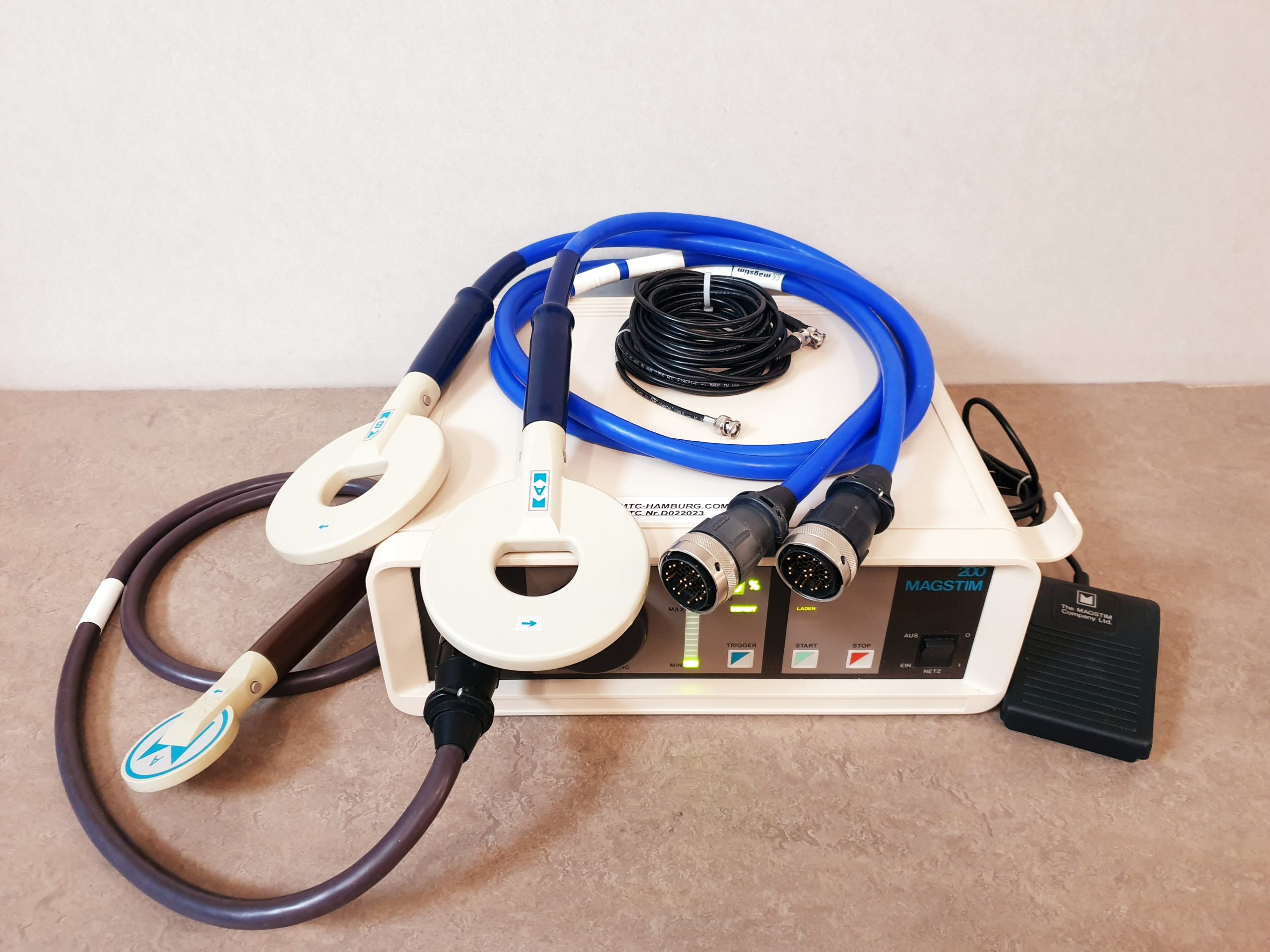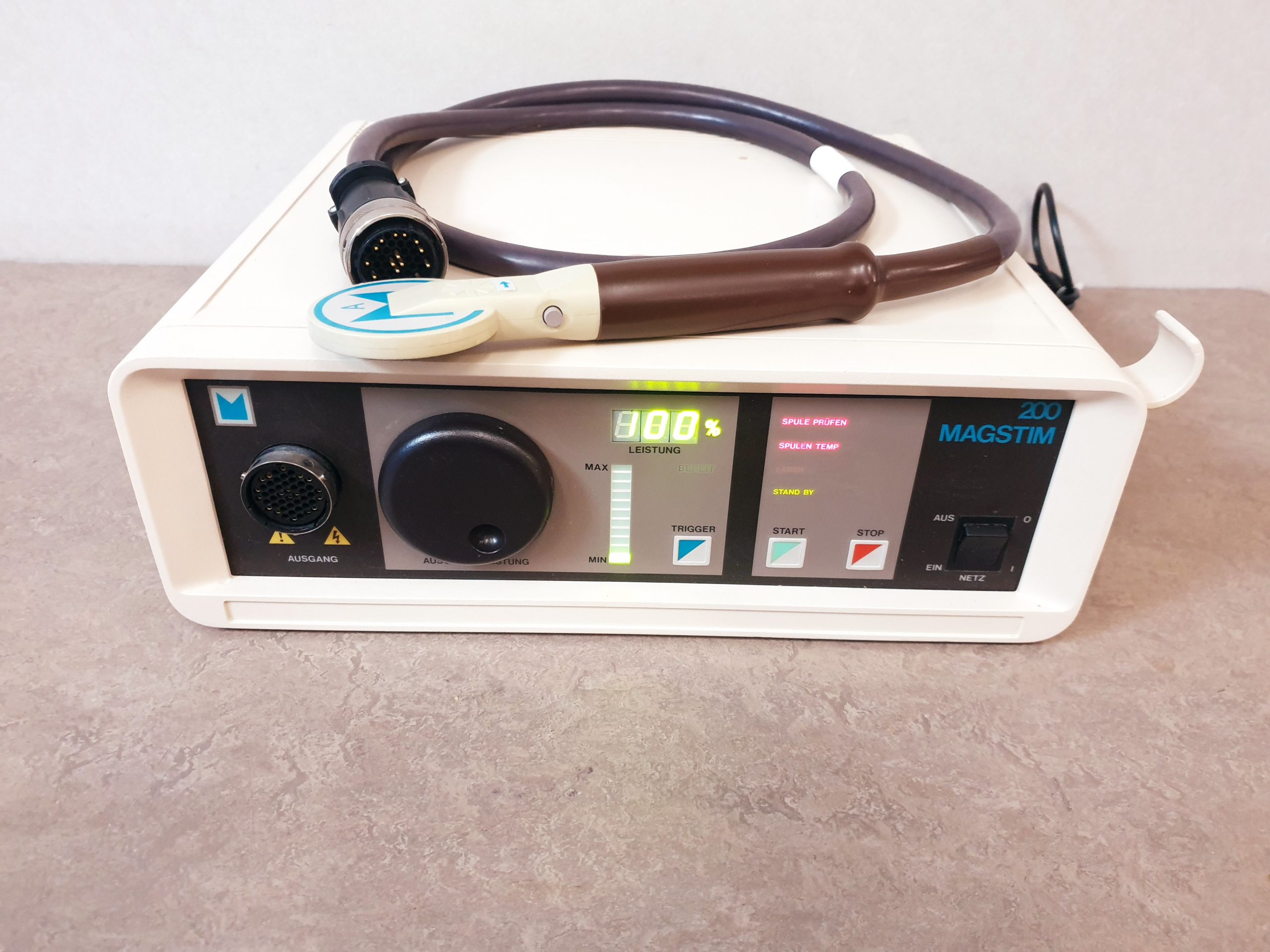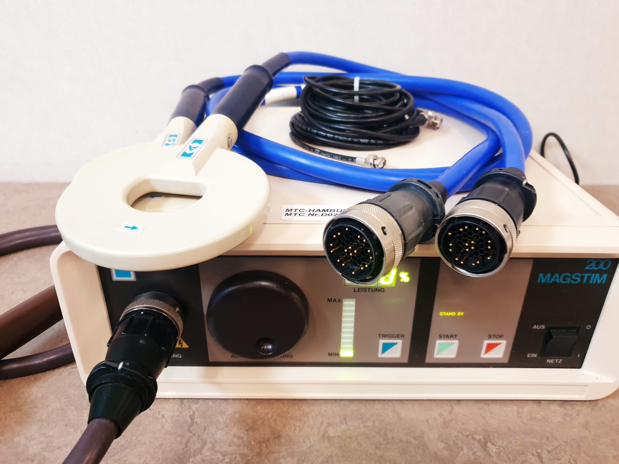 - Leistungsstarke Magnetstimulation: Der Magstim 200 erzeugt starke, kurzzeitige Magnetimpulse mit hoher Feldstärke, die eine gezielte Aktivierung neuronaler Strukturen gewährleisten.