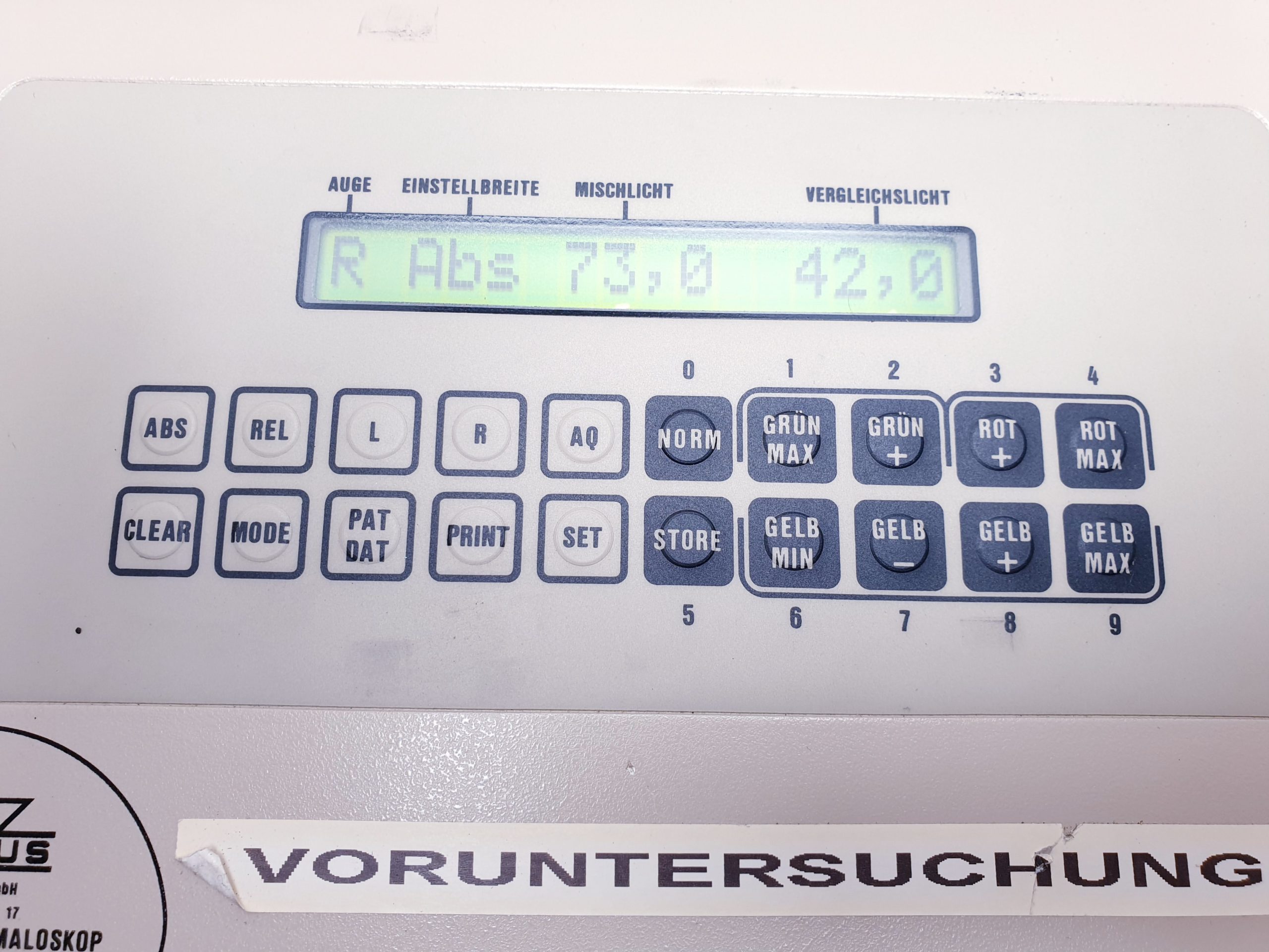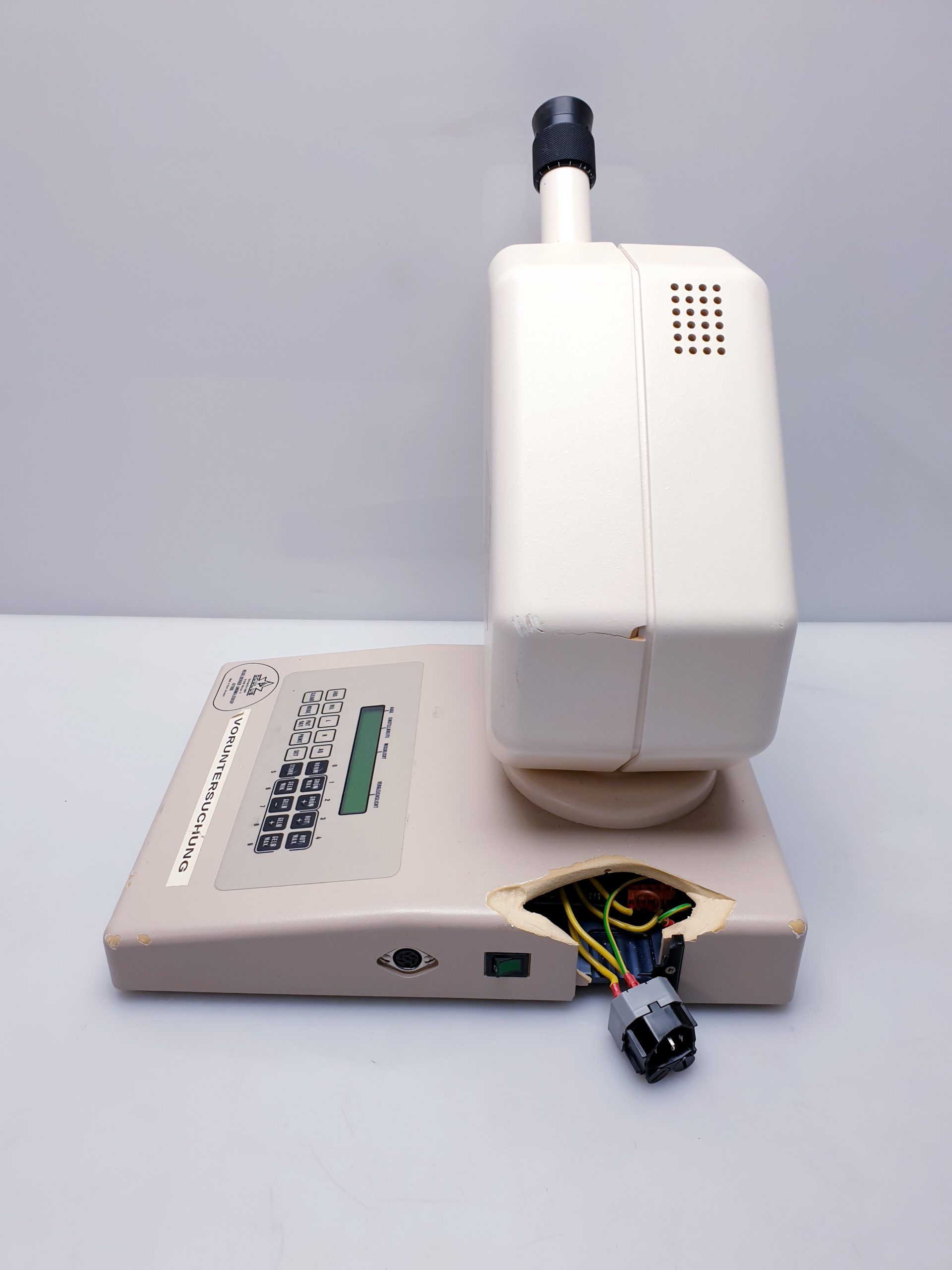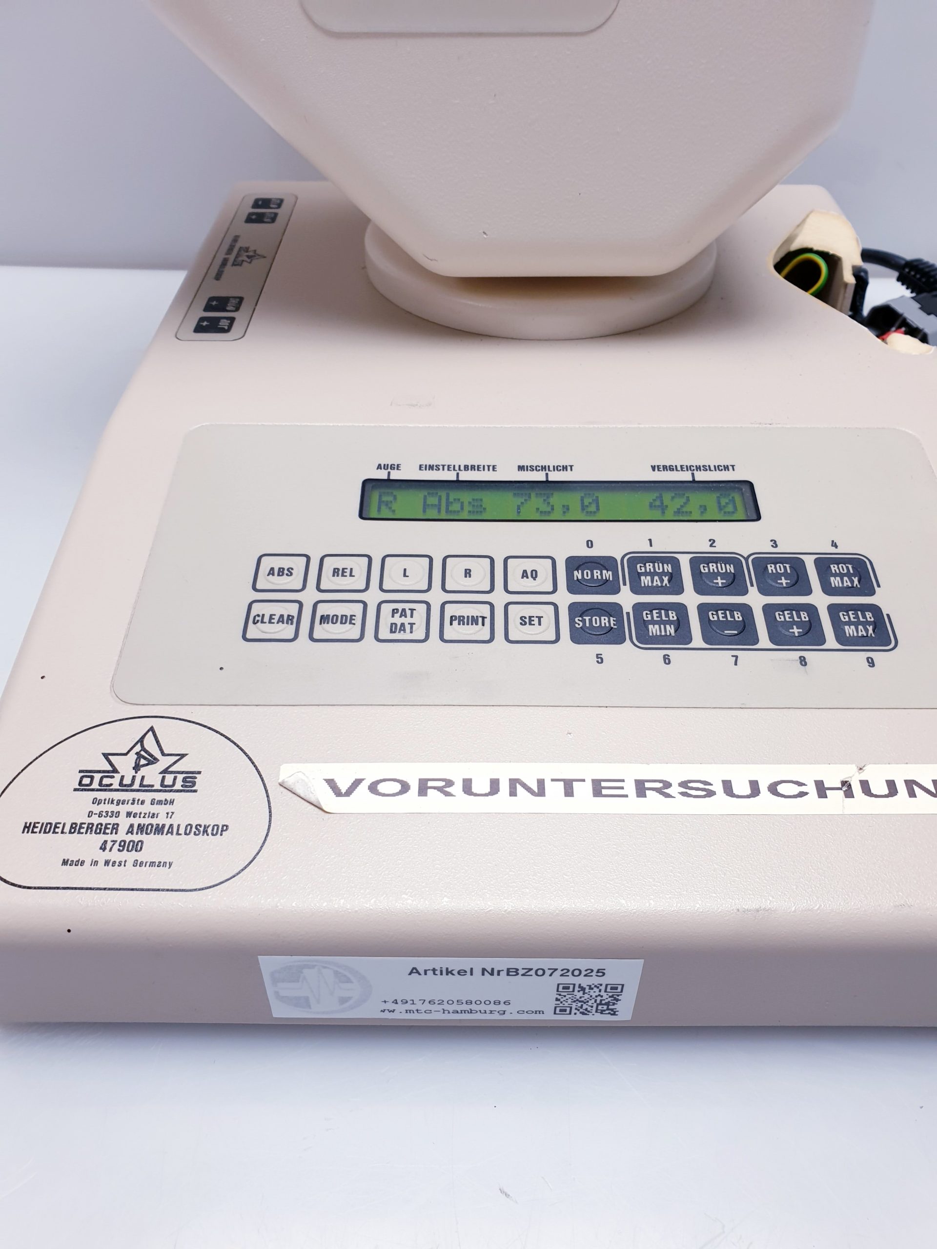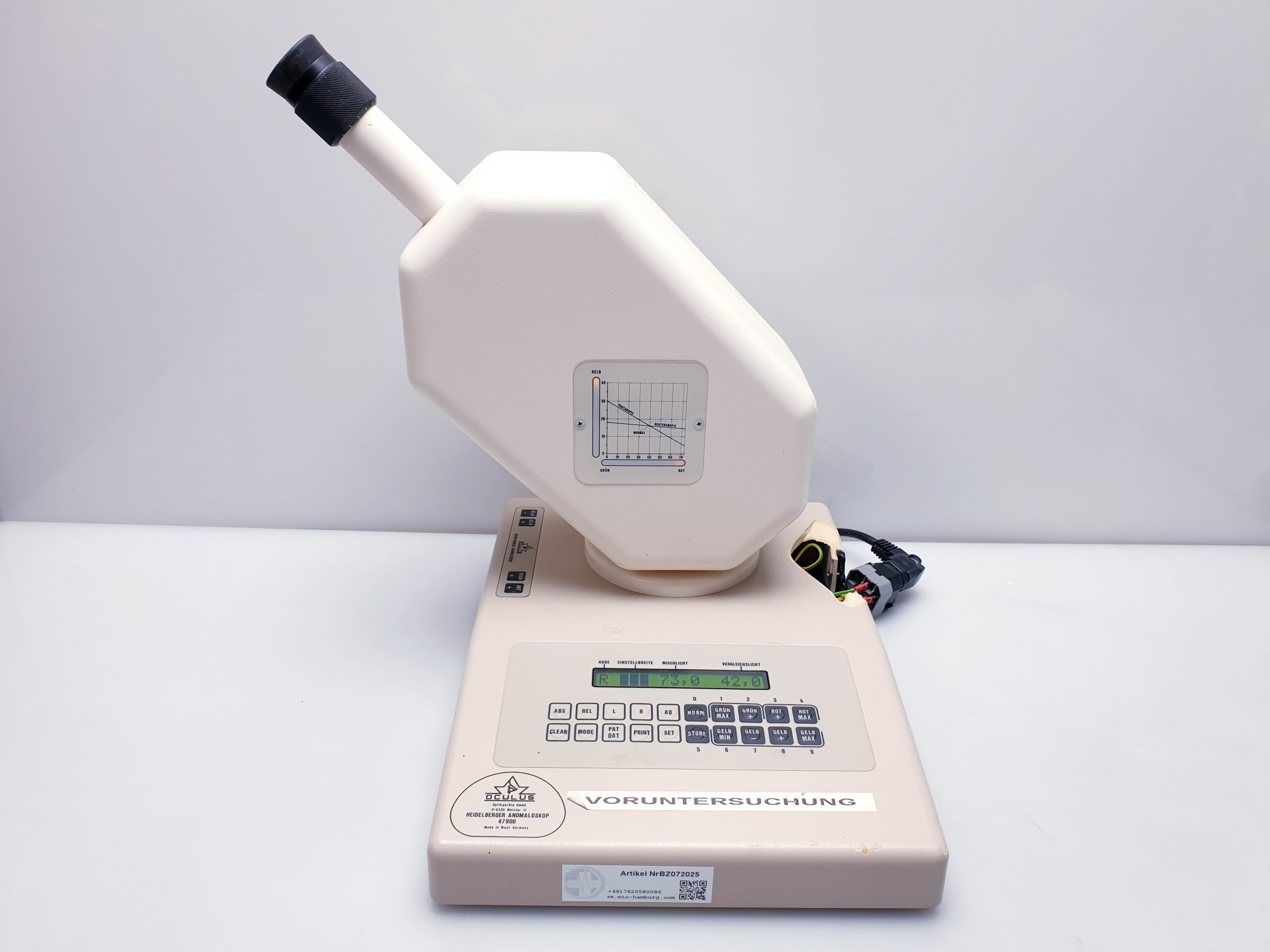 Oculus Heidelberger 47900 Anomaloskop ist ein präzises Diagnostikinstrument zur Untersuchung von Farbsehstörungen. Dieses Gerät weist einen Transportschaden auf, der die Funktionalität beeinträchtigen kann und daher vor dem Einsatz überprüft werden sollte.