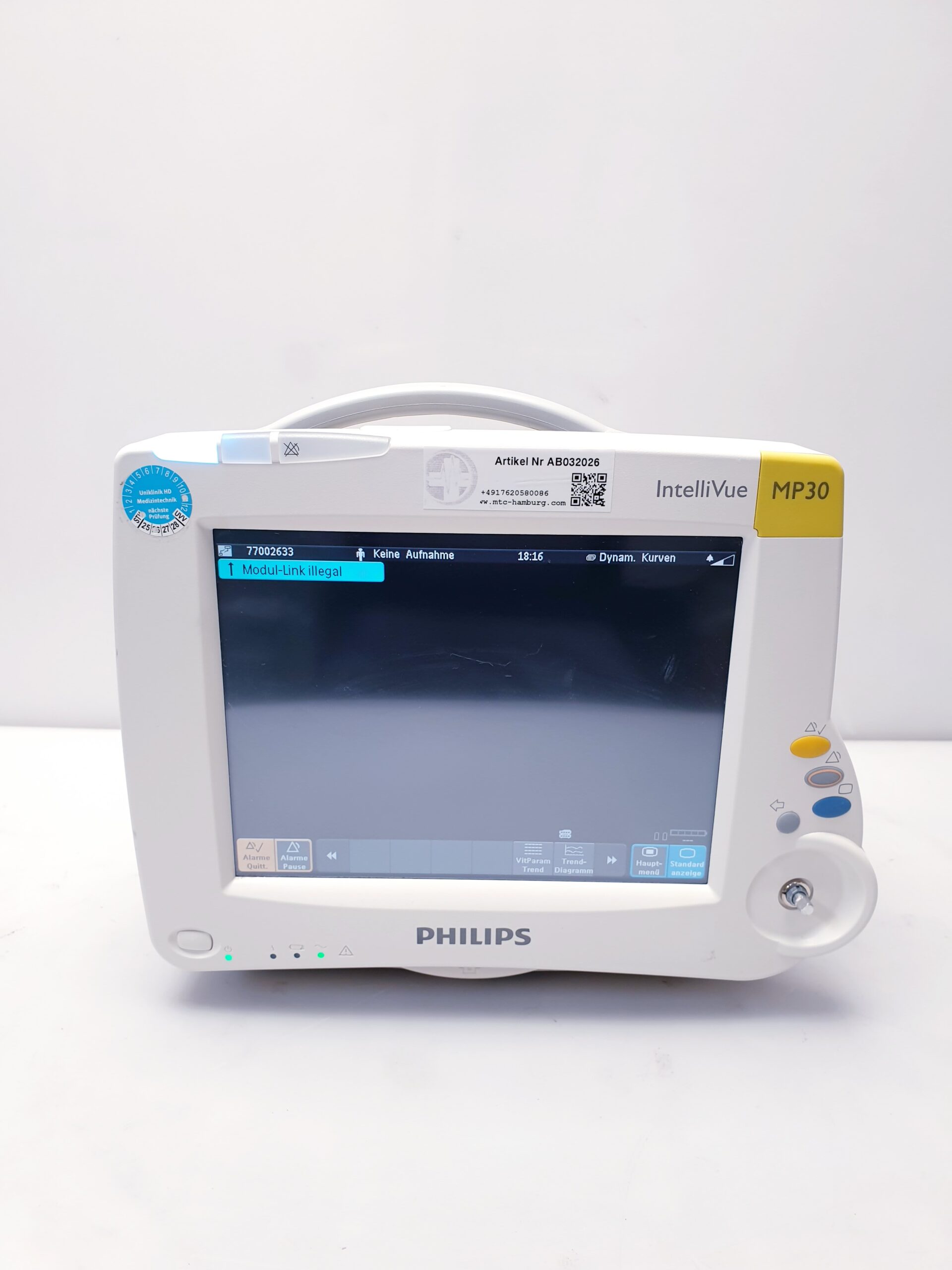 Der Philips IntelliVue MP30 (Modell M8002A) ist einer der verbreitetsten Patientenmonitore für den klinischen Einsatz. Er ist kompakt genug für den Transport, aber leistungsstark genug für die Intermediate Care (IMC) oder den OP.