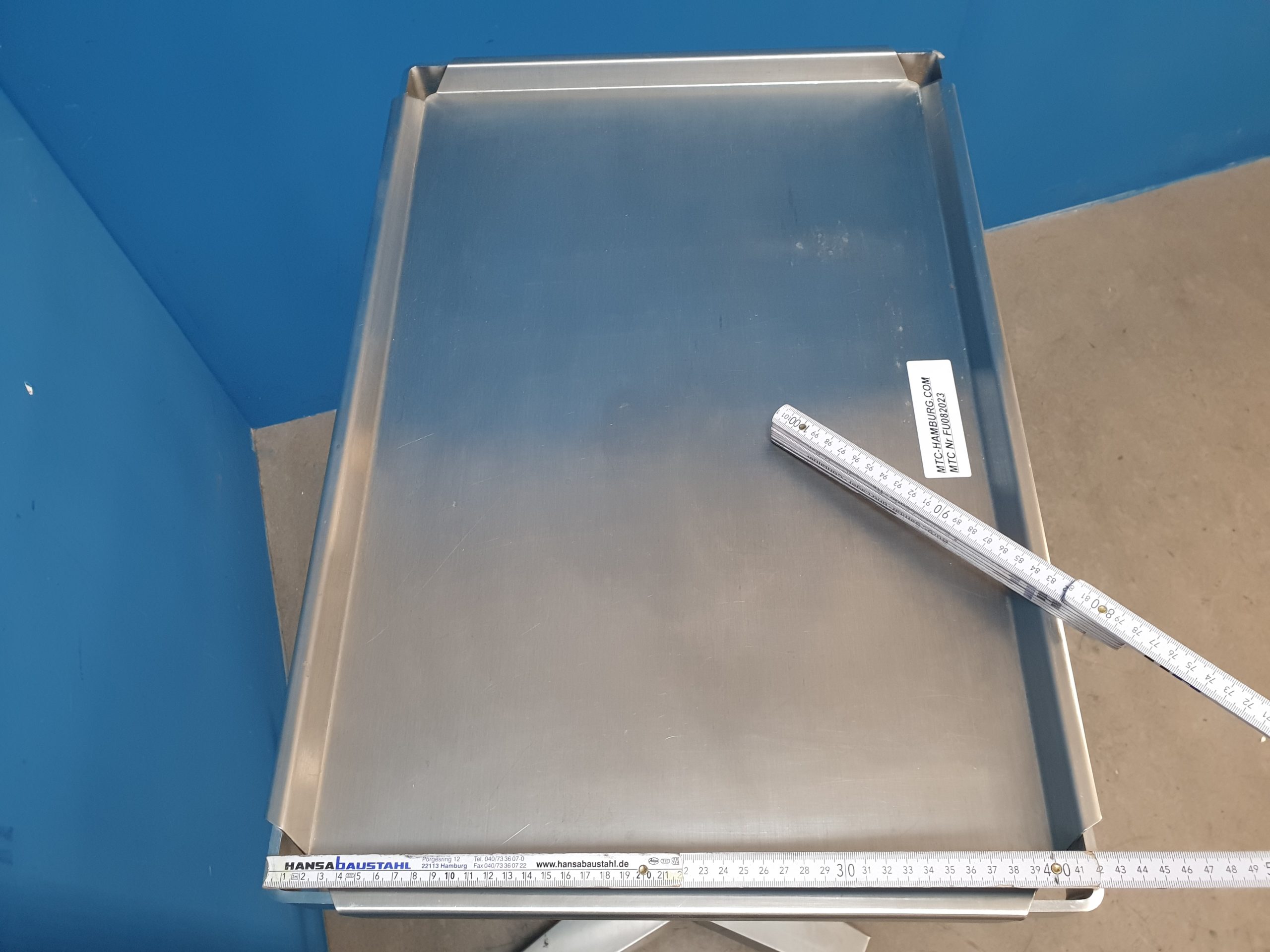 Tischplatte und Gestell aus Cr-Ni-Stahl. Rollen 50 mm Durchmesser, elektrisch leitend.