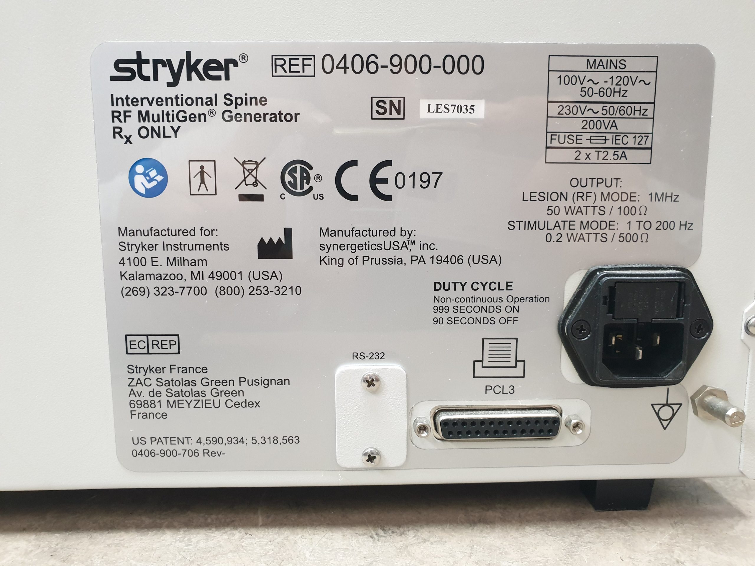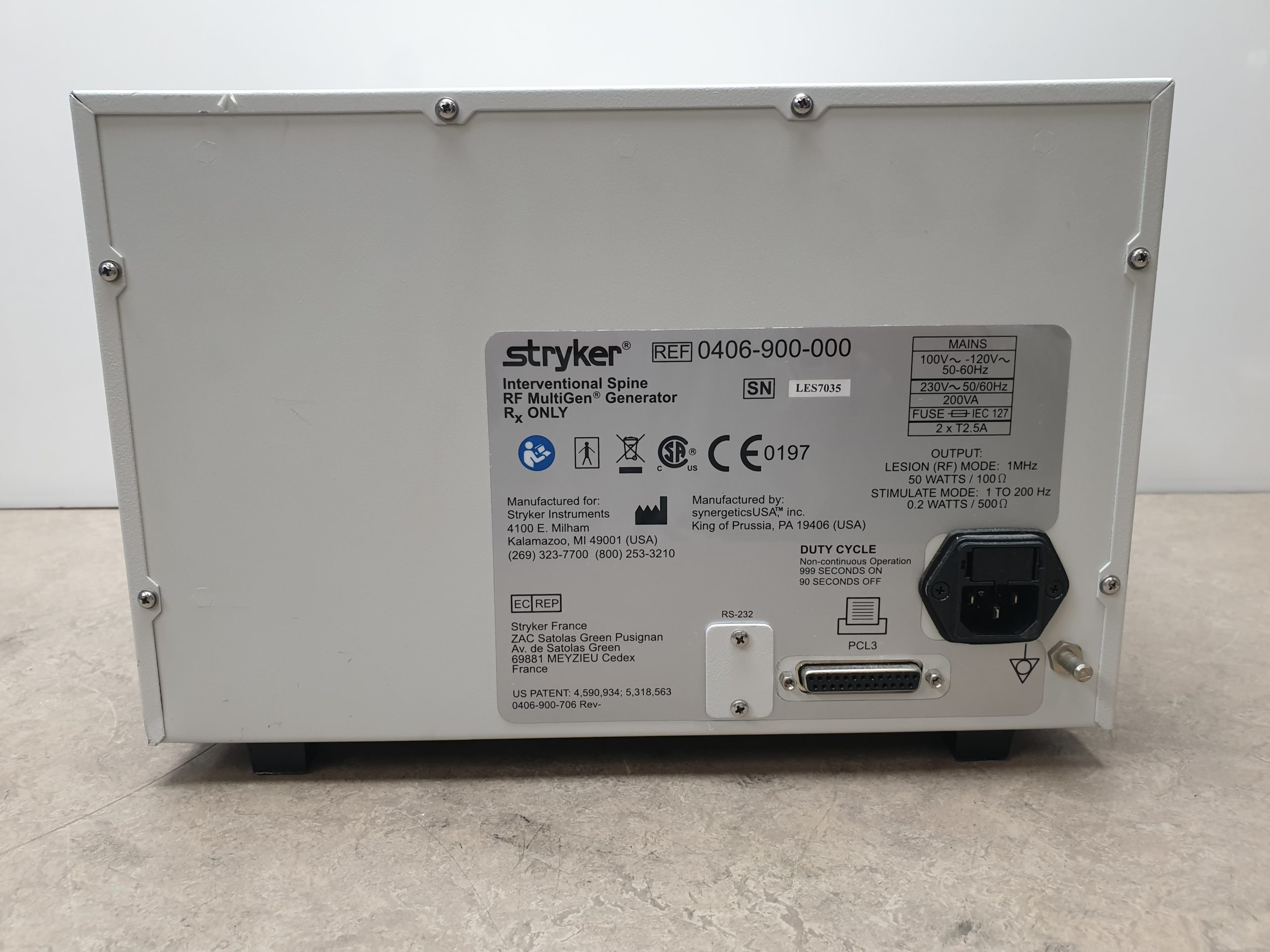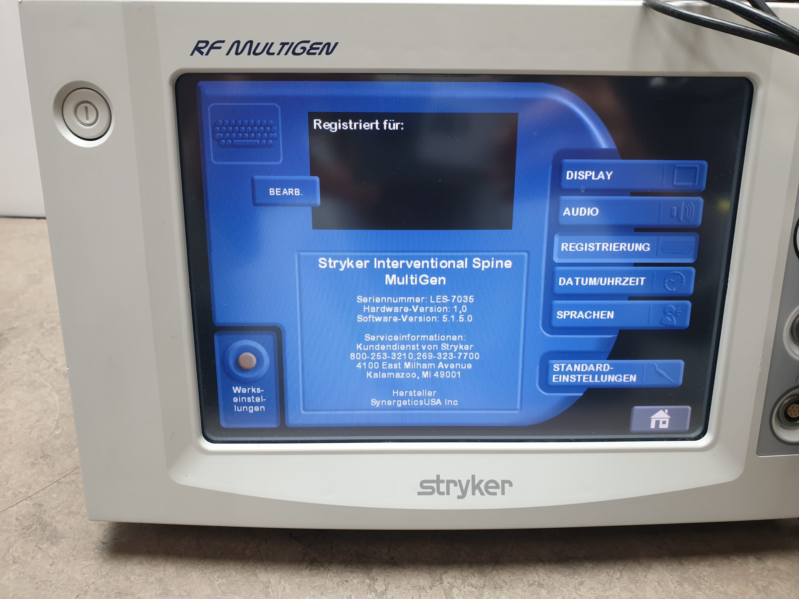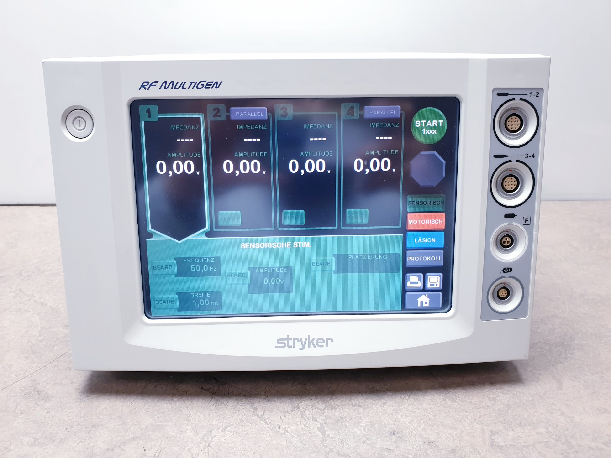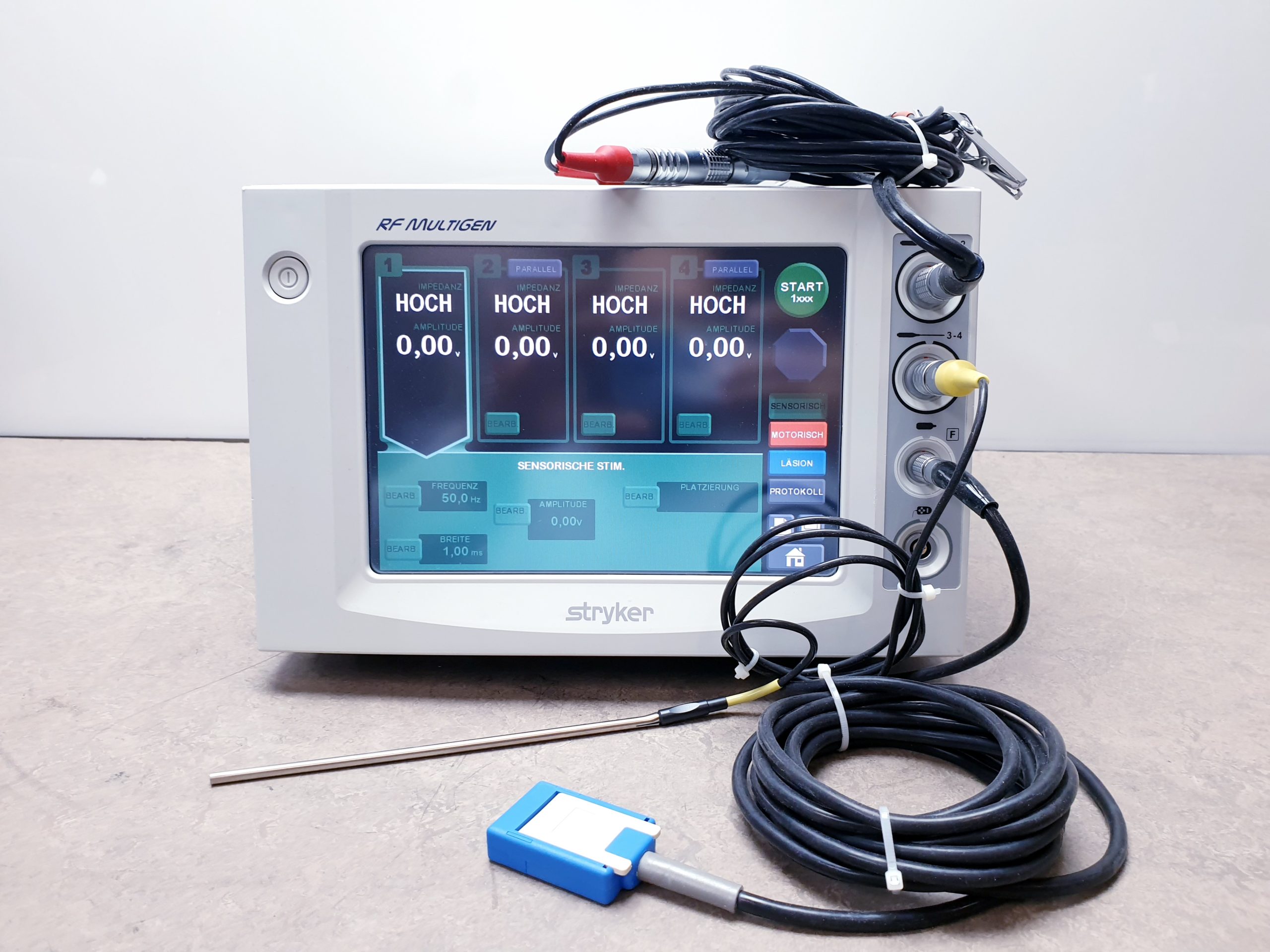 Der Stryker RF MultiGen 0406-900-000 ist ein Radiofrequenzgenerator, der in der interventionellen Schmerztherapie und Wirbelsäulenchirurgie eingesetzt wird. Er wird häufig zur Durchführung von radiofrequenten Ablationen verwendet, um Schmerzen zu lindern, die durch verschiedene Erkrankungen des Bewegungsapparates verursacht werden. Hier sind einige der Hauptmerkmale und Zubehörteile des Stryker RF MultiGen: