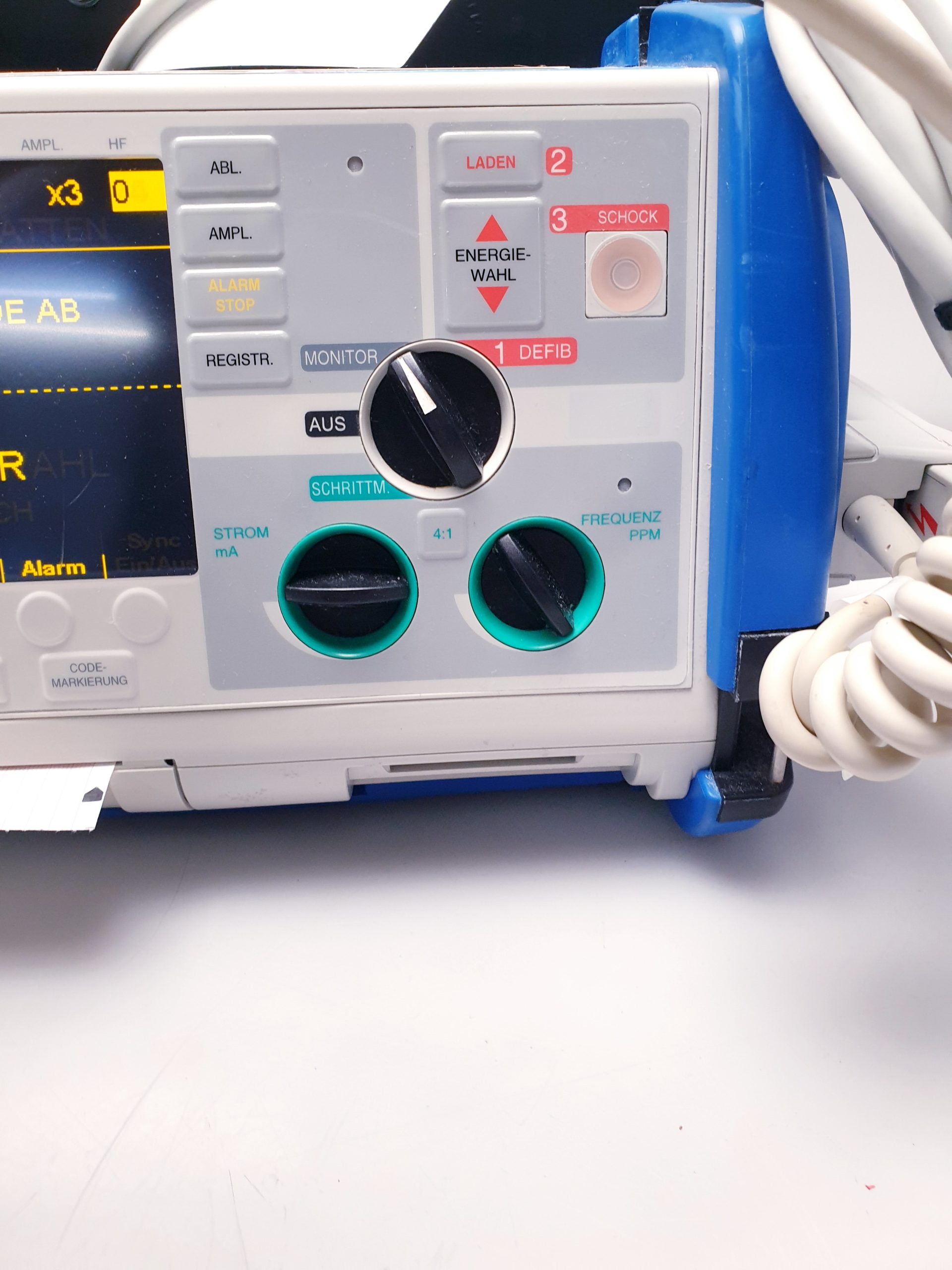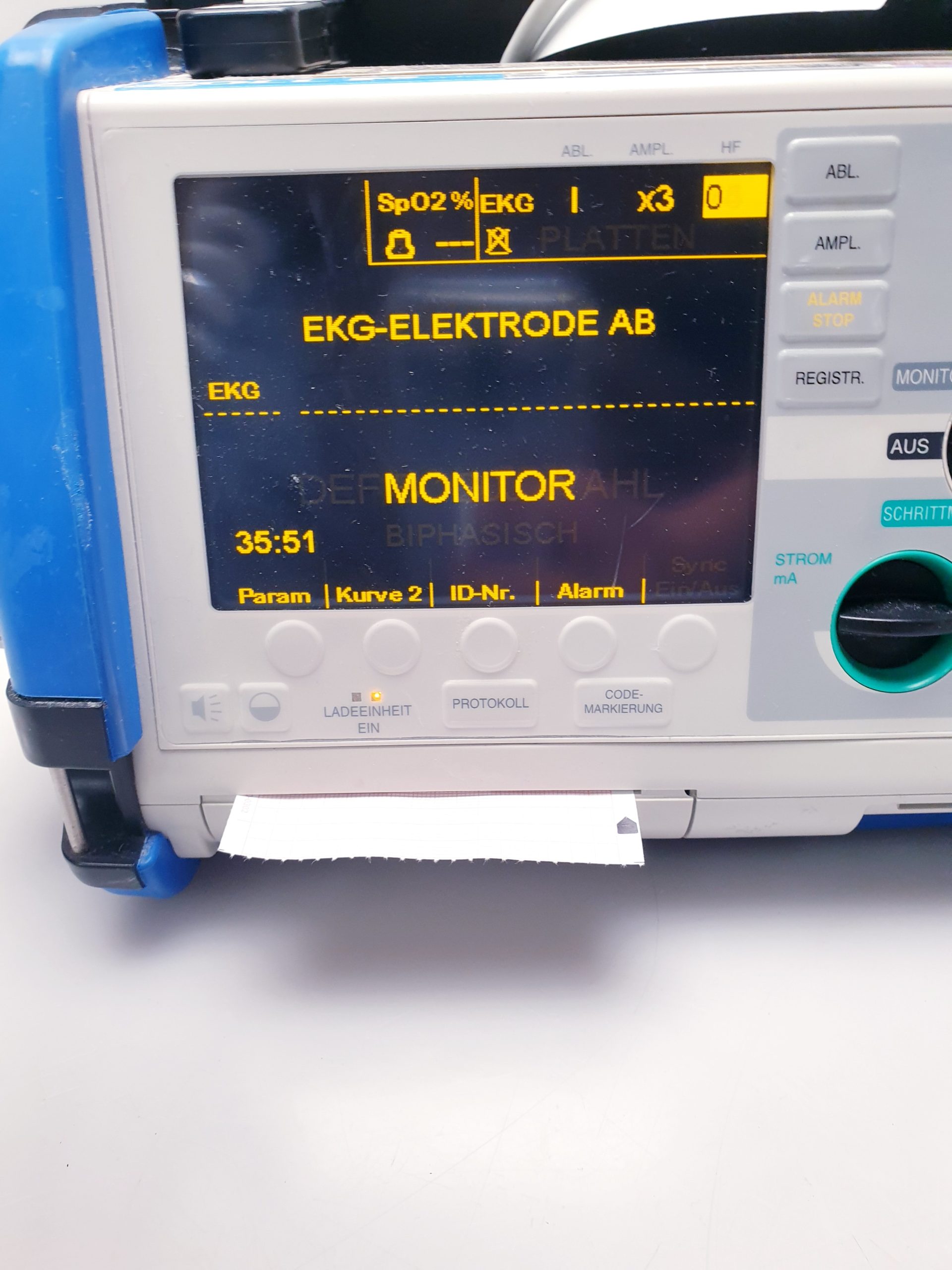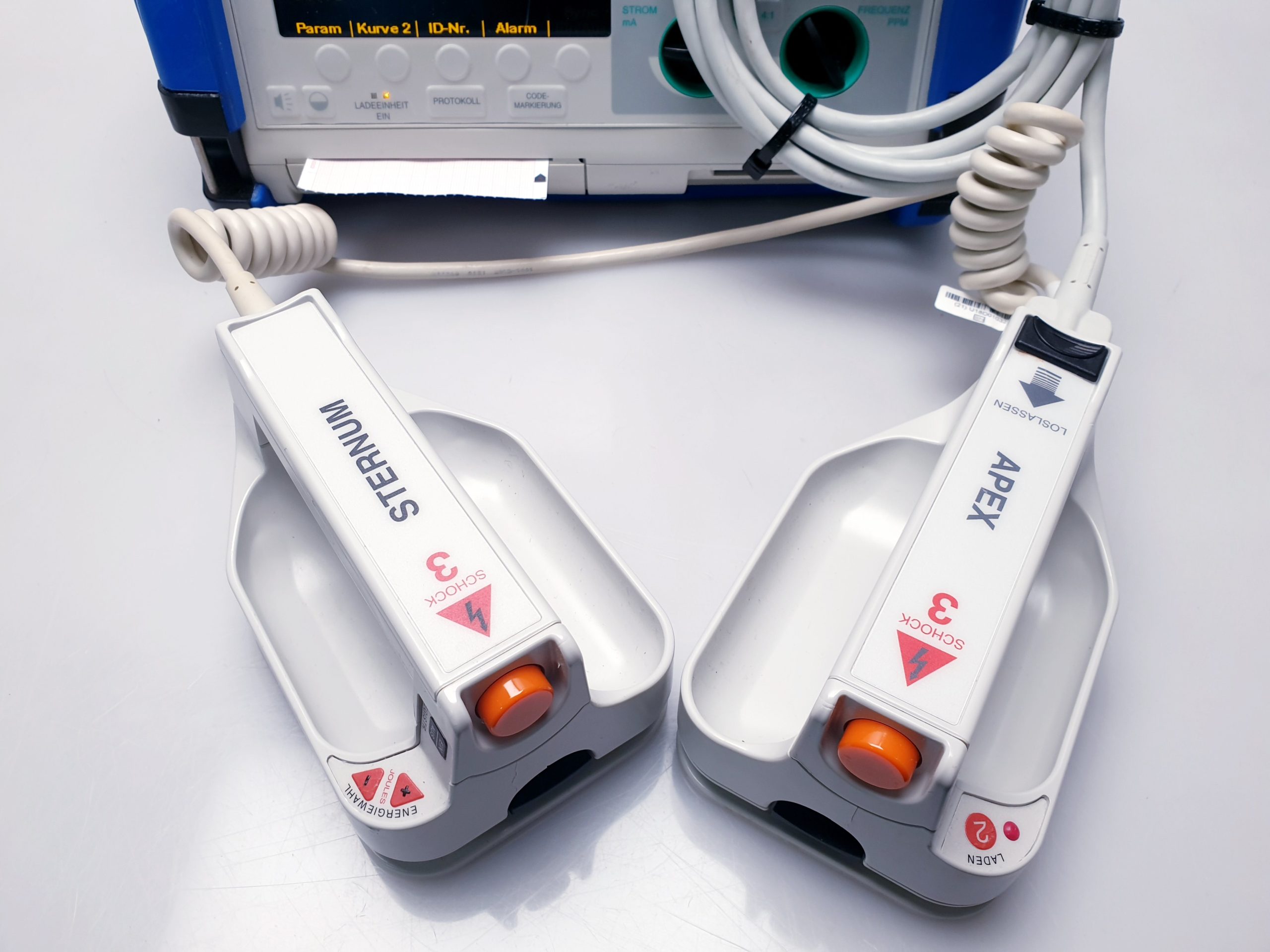 - Großzügiges, gut ablesbares Display: Ein hochauflösendes Farbdisplay ermöglicht die klare Darstellung von EKG-Wellenformen, Vitalparametern und Therapieanweisungen, was die Bedienung auch unter stressigen Bedingungen erleichtert.